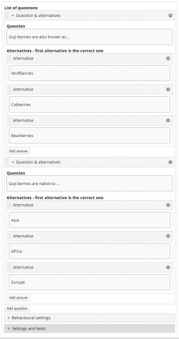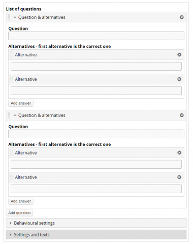 button in the top left corner of the alternative. Just remember the top alternative is the correct one. You can delete the question & alternatives or alternative by using the